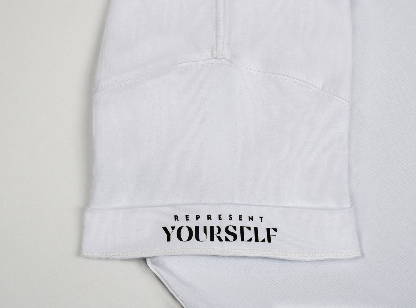 Custom puff printing on the chest, halfmoon embroidered logo at the back neck, plus a hidden printed “Represent Yourself” logo inside the sleeve visible when rolled up.